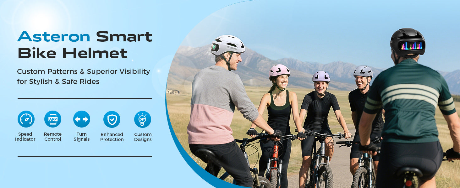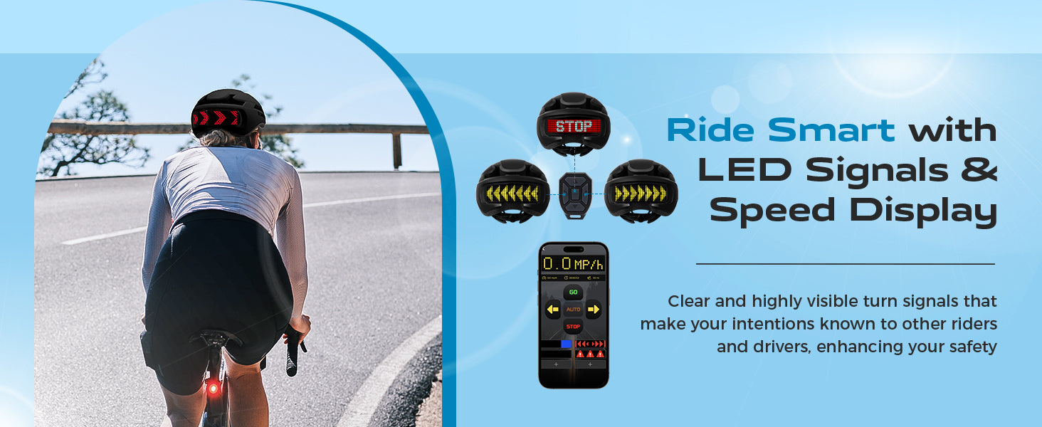 A smart cycling helmet built to improve visibility and communication on the road—turn signals, brake alert, and bright rear lighting for confident rides.